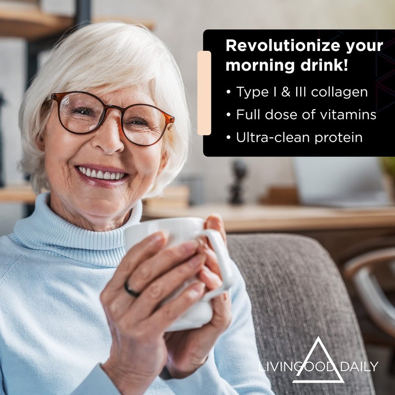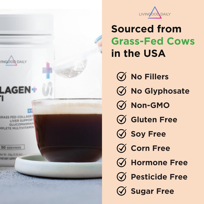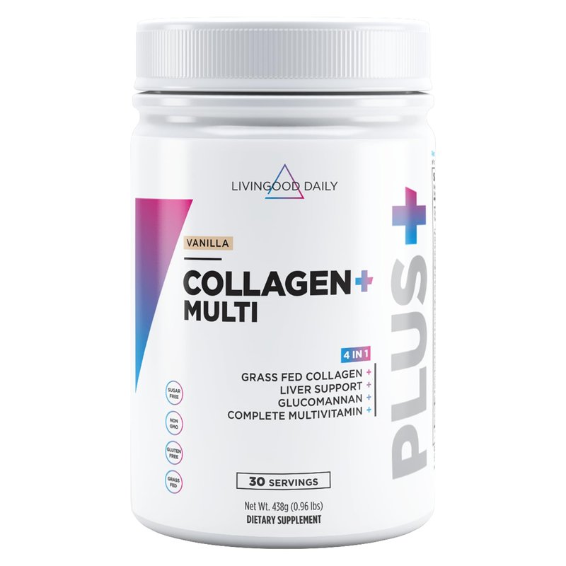 Livingood Daily Collagen + Multi is the perfect all-in-one meal replacement or add on to a morning coffee, smoothie, or midday drink. It is a complete blend of skin, hair, nail, and gut-friendly grass-fed collagen + vitamin C boosting absorption + a full bottle of multivitamins and minerals + the liver protection and detoxification of milk thistle + the extra benefits from glucomannan.