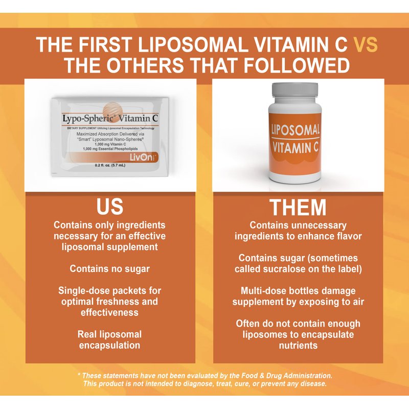 Most ordinary forms of oral Vitamin C, tablets, capsules, powders, liquids and even Vitamin C from your diet, may not be processed and absorbed efficiently by your body. As a result, much of this Vitamin C is never transferred into your bloodstream and even less of it makes it into your cells. When you take 1,000 milligrams or more of regular oral Vitamin C, more than half of it is passed as waste by your body.1 Until now... Unlike pills and powders, which may not be absorbed efficiently, Lypo Spheric products use liposomes made from Essential Phospholipids to improve absorption. Phospholipids are primary building blocks of the cellular membrane: the thin, protective wall around each cell in your body. The phospholipid wall functions as a skin for each cell, keeping things in or out. While your body can make some phospholipid compounds on its own, others must be supplied by your diet. These are called essential phospholipids. Lypo C gives you 1,000 milligrams of Vitamin C AND 1,000 milligrams of Essential Phospholipids in each packet, including Phosphatidylcholine, an important phospholipid required for maintaining a healthy cardiovascular, reproductive, immune, and nervous system. 1Source: NIH Dietary Supplement Fact Sheet: Vitamin C Note: These statements have not been evaluated by the Food and Drug Administration. This product is not intended to diagnose, treat, cure or prevent any disease. LivOn Labs Product Lines Include: Lypo Spheric, Lypricel and Altrient.