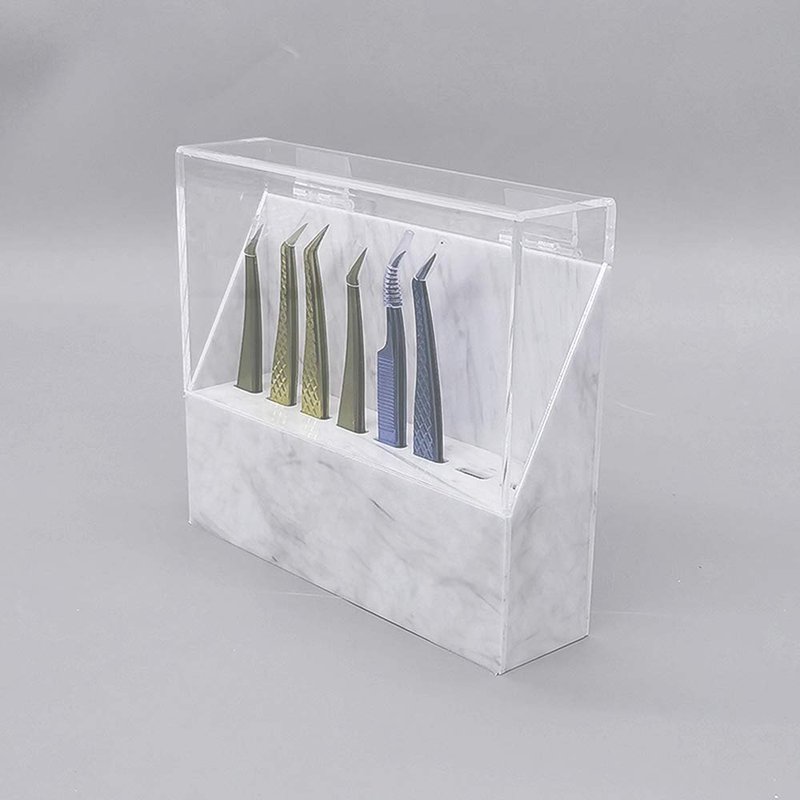 - High Quality -- The tweezers holder is made of marbled acrylic, durable, and with dust-proof cover. The shape of the tweezers holder is simple, the size is compact, and the clamshell design can keep the tweezers clean.