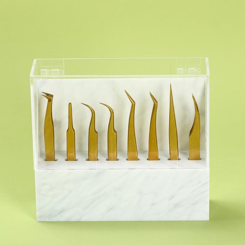 1. The tweezers holder is made of marbled acrylic, durable, and with dust-proof cover. The shape of the tweezers holder is simple, the size is compact, and the clamshell design can keep the tweezers clean.