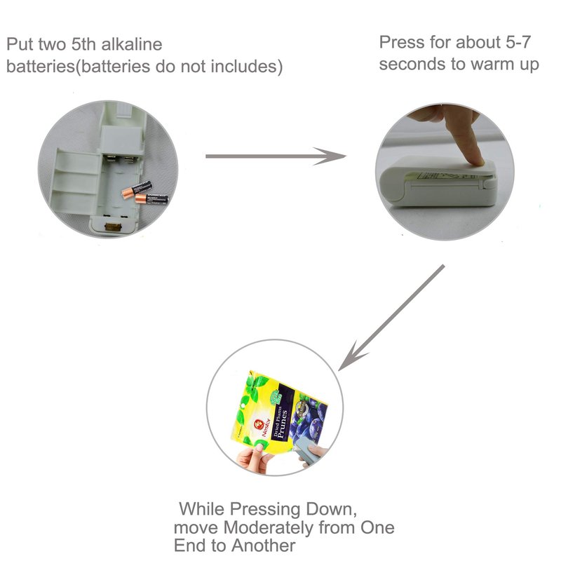 - Package includes - 2 X Mini Bag Heat Sealer (White) Please use 2 X AA alkaline batteries (The package does not includes batteries and needs to be prepared by oneself),Ordinary AA batteries do not generate enough heat
