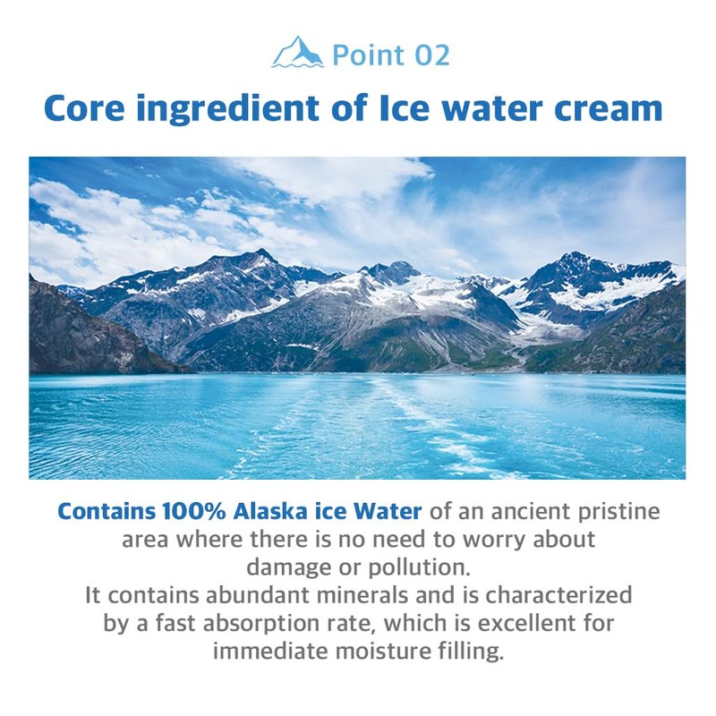 - [WHY ICE WATER CREAM?] Contains 100,000 ppm of clean glacial water rich in minerals. The glacial water extract whith a cluster structure that is efftive in skin absorption, provides moisture deep into the skin and helps maintain smooth and moisturized skin.