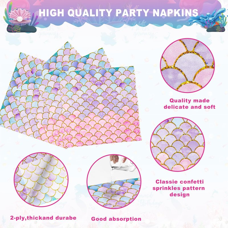 - 【Fun Mermaid Scale Design】This mermaid scale party napkins set is designed in vibrant mermaid scales patterns, the perfect addition to any girls' mermaid-themed party or event. Decorating your party table with these disposable napkins can add a unique touch to your gathering and make it look more fun and exciting.