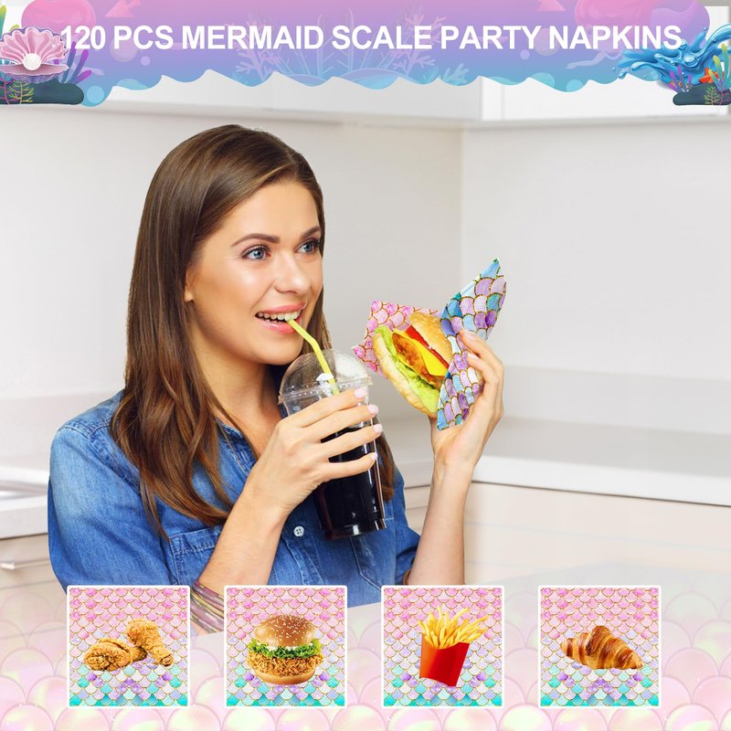 LMJUNZZ 120 Pcs Mermaid Scale Party Napkins Mermaid Birthday Party Disposable Paper Napkins for Girls' Birthday Party Supplies Decoration Set