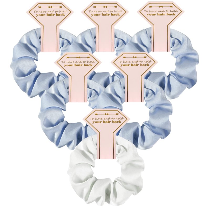Loanzeg Satin Bridesmaid Scrunchies Bachelorette Hair Ties Set of 6 Bridal Shower No Damage Hairties ideas Gift for Wedding Party Favors Bridesmaid Proposal Gifts (White&Blue)