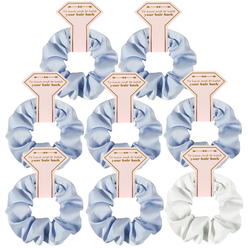 Loanzeg Satin Bridesmaid Scrunchies Bachelorette Hair Ties Set of 8 Bridal Shower No Damage Hairties ideas Gift for Wedding Party Favors Bridesmaid Proposal Gifts (8pcs White&Dusty Blue)