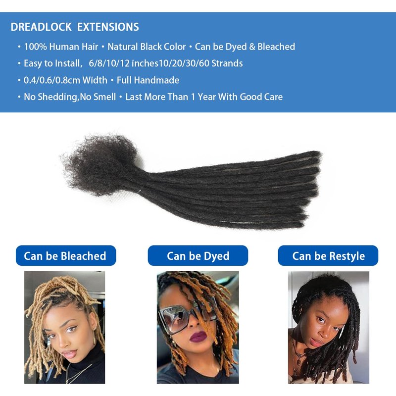 - ♥Hair Material: Loc extensions human hair 6/8/10/12inch 0.6cm Thickness Dreadlocks, Made of 100% human hair, Soft, Light Weight and Natural, Can be bleached, Dyed, Curled and Twisted. Occasionally There may be a Difference Because of Full Handmade.