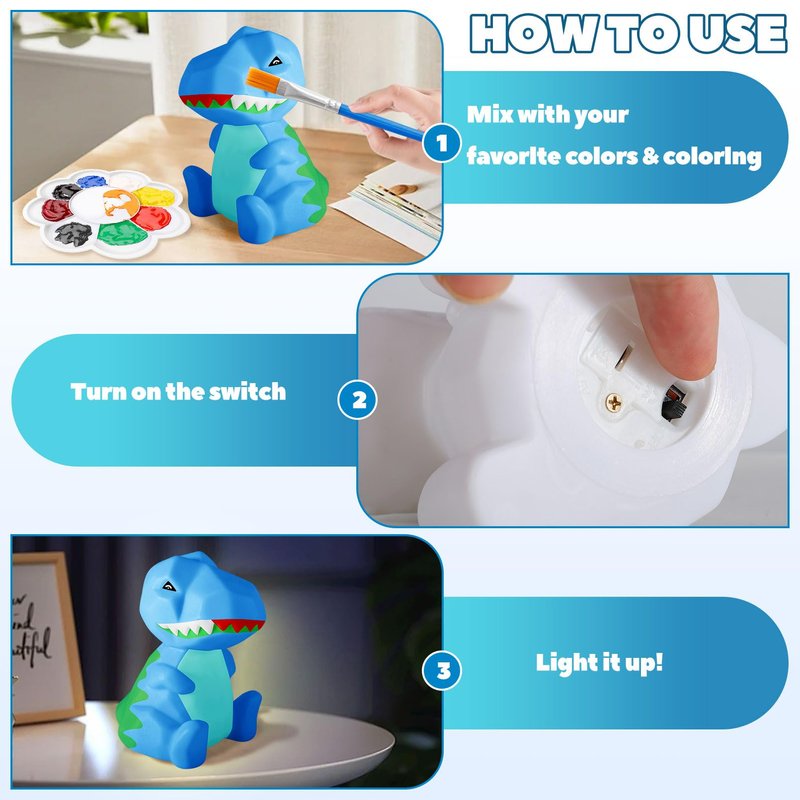 Comes with paint colors, 1 white dinosaur lamp, you can freely color it to make a dinosaur night light and enjoy the fun of DIY This dinosaur lamp can be given as a gift to family and friends on Halloween, Christmas, and Christmas. It's a great craft and school project Specifications: