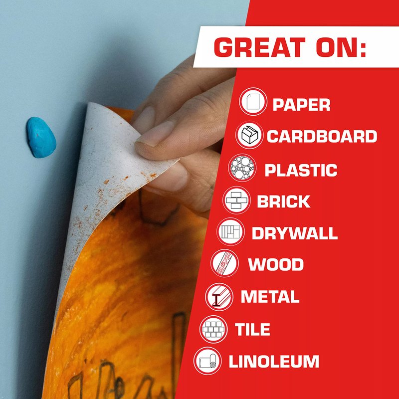 - Versatile: Sticks to paper, wood, tile, linoleum, cinderblock, brick, metal, plastic, mirrors, and glass