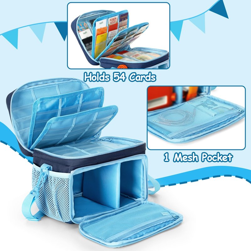 - Upper Compartment: The upper compartment features zipper opening with 9 card slots per page, this audio book bag holds up to 54 player cards