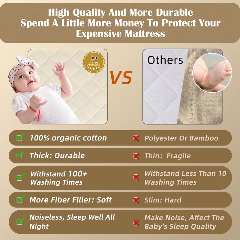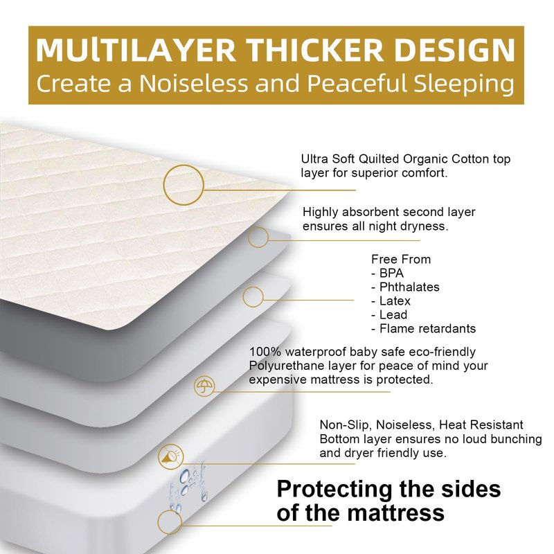 TOP&SIDE WATERPROOF 5X PROTECTION: Hypoallergenic organic cotton top provides soft gentle comfort. Inner polyester fiber fill layer increases absorbency. Breathable waterproof layer prevents leaking. Soft knit back and nonwoven layer offer top and extra side waterproof protection, which can prevent pee or any other liquid from leaking into the crib mattress through 4 sides. THICKER WATERPROOF TPU LAYER WITHSTANDING 100+ WASHING TIMES: The TPU we used is 0.02mm which is much thicker than 0.015mm in the market. This means our crib mattress protector can withstand more washing times and still stay waterproof after washing. You just spend a little more money but get a more durable crib mattress cover equivalent to 10 ordinary crib mattress pads. ORGANIC COTTON PROTECTS YOUR BABY'S SKIN: Our organic crib mattress pad is extremely soft to the touch, hypoallergenic, even to a baby’s skin. NOISELESS AND BREATHABLE: A quiet and comfortable sleeping is so improtant to your little baby. The fluffy cotton padded quilting is soft and breathable to cradle your baby in comfort so they sleep better. Besides, it won't make any noise when your little baby moves. FITS ANY SIZE BABY CRIB MATTRESS AND MACHINE WASHABLE: Our 52'' x 28'' x 9'' crib mattress protector has an elastic all around. It won't slip off or bunch together. Machine wash - For frequent accidents, buy 2 or more - while one is washed, the other protects the mattress.