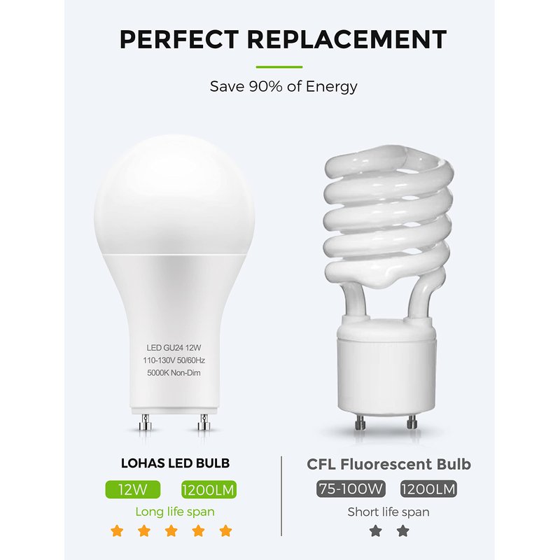 - Cost&Energy Saving- 12W GU24 LED bulb saves you 85% on your electricity bill compared to 100 watt halogen/incandescent and CFL bulbs while only using 12W of power. To move you towards a low-carbon life.