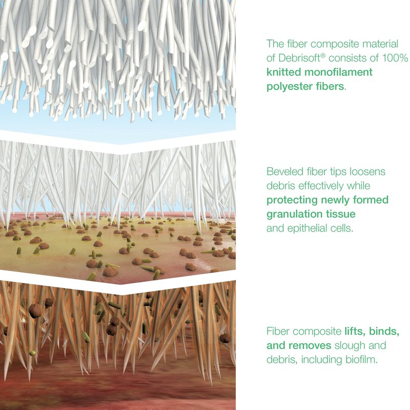 - Safely cleans wounds by removing slough, debris, biofilm, and bacterial load