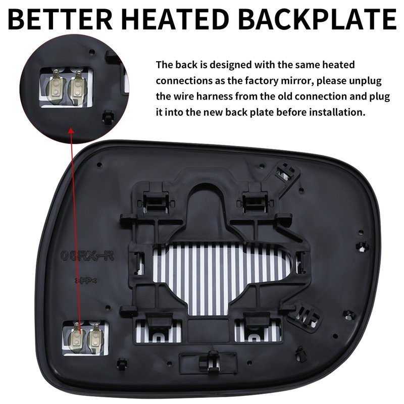 - 【Easy Installation & You can complete the replacement in a few minutes】The same mounting point as the factory mirrors glass. Completely suitable for existing wires and interfaces. Before installation, the wiring harness must be unplugged from the existing backplane and inserted into the new backplane.
