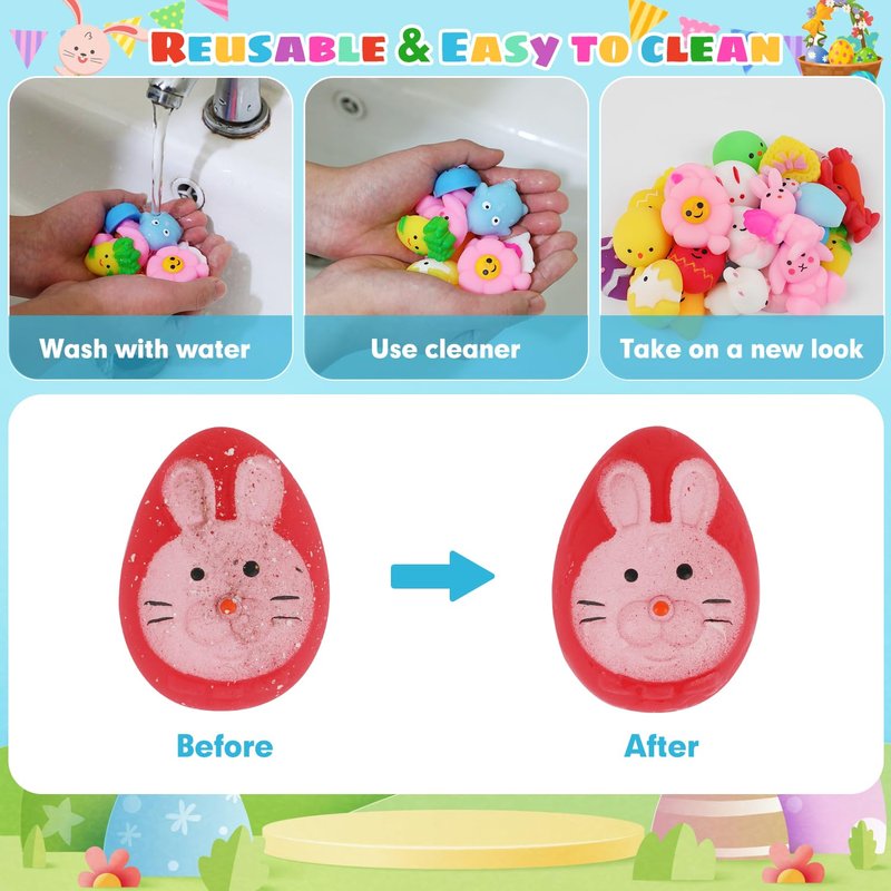 - Easy to Clean: The Easter squishies is also easy to clean with soap and water when they are dirty. Just put talcum powder on them after cleaning and you'll get the squishy toys like new, easy and fun