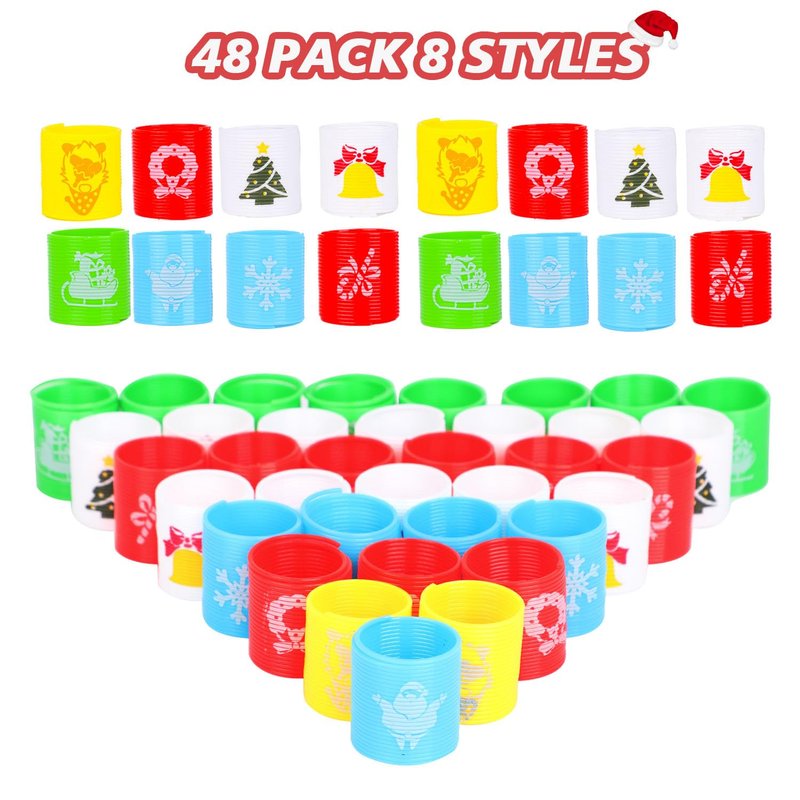 - Value Pack: You will get 48pcs Christmas coil springs in 8 Christmas pattern ( Santa Claus, bells, candy cane, wreaths, snowflakes, gnome, sleds, Christmas trees) with bright colors. These spring toys are fun toys for adults and children to meet entertainment needs