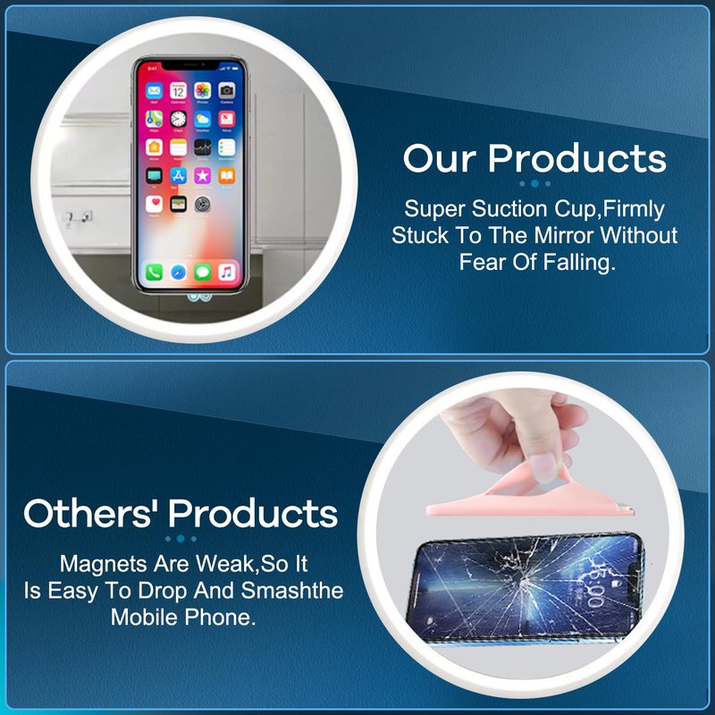 2.A Strong Grip on the Smooth Surface: You can easily hang your phone anywhere with a smooth surface with strong and reliable individual suction cups. The suction cups is sturdy and it not only sticks to mirrors, it also sticks to windows, refrigerators, tiles and other clean, flat, smooth surfaces.