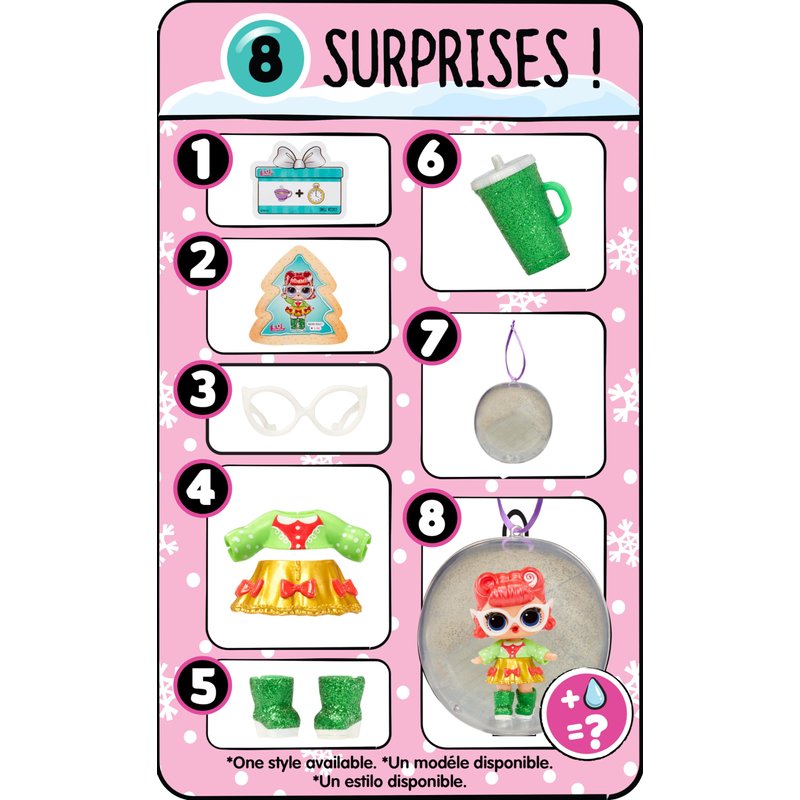 - 8 SURPRISES: Includes: (1) 1 Limited edition L.O.L. Surprise! Holiday Present Surprise doll; (2) Outfit; (3) Shoes; (4) Bottle; (5) Accessory; (6) Sticker; (7) Secret Message; (8) Ornament Ball