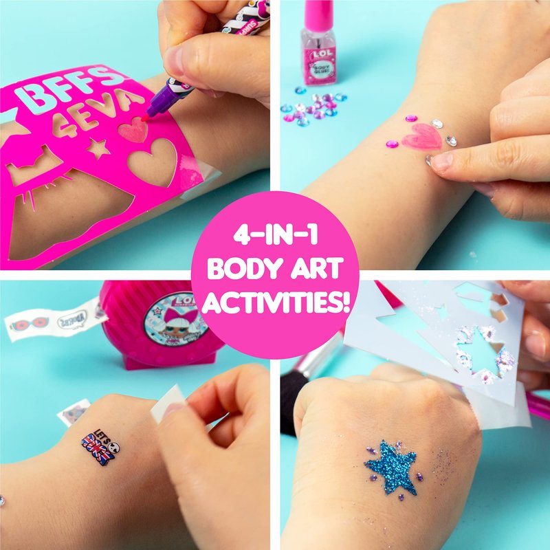 - SET INCLUDES: 1 Surprise Plastic Tattoo Dispenser (3 in. x 1 in), 6 Tattoo Sheets, 3 Surprise Blind Bags with Surprise Tattoos & Assorted Body Gemstones, 2 Body Art Markers (1 Red, 1 Teal), 1 Body Glue (4 mL), 5 Body Glitter Packets (1 Gold, 1 White, 1 Purple, 1 Teal, 1 Pink, 1 Red), 3 Stencils, 2 Cosmetic Brushes, Easy-to-Follow instructions