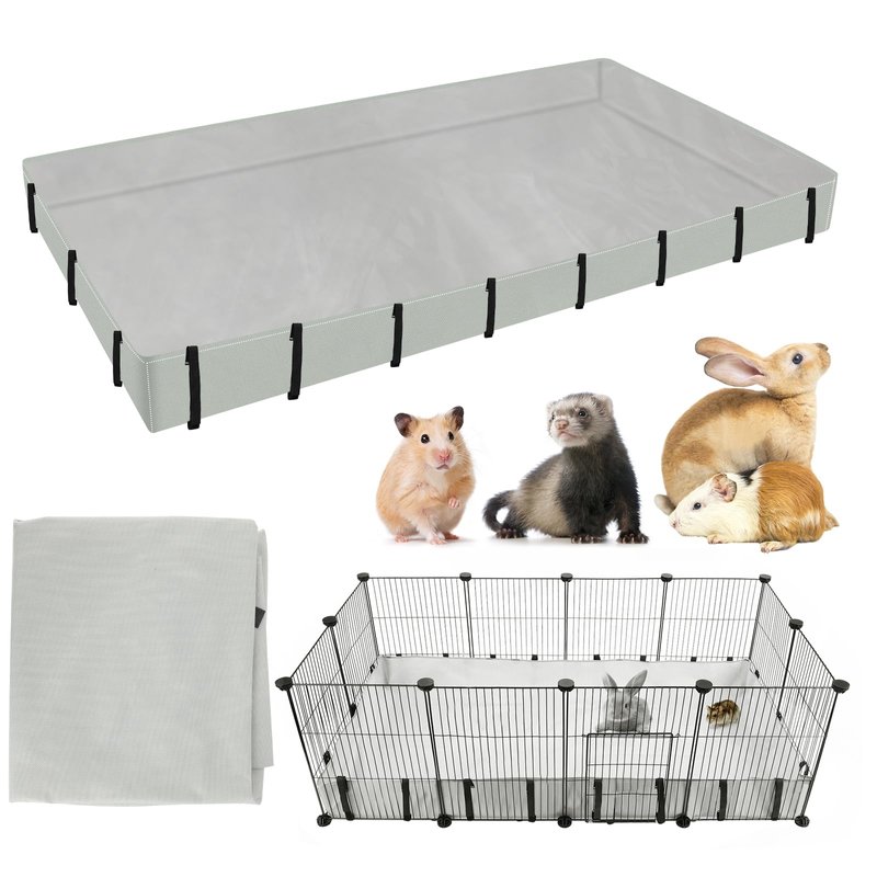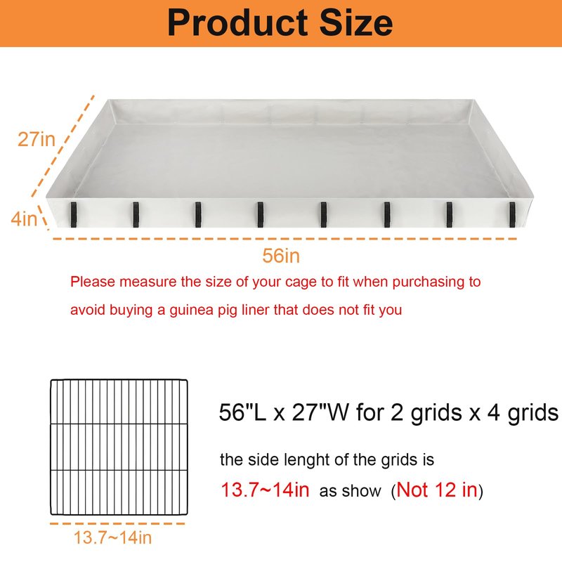 A Delightful Surprise: The raised sides of the guinea pig liner help to keep the cage clean and protected from droppings, urine, and hay spills on the floor. Velcro strap to attach cage liner to cage provide firm support to raised edge. Washable & Reusable The washable and reusable guinea pig bedding bottom liner base makes it easy to sweep or shake the dry grass and debris out of the liner, and when soiled and ready to be replaced, simply throw the liner in water for cleaning. We recommend that you prepare 1-2 liners to switch between different washing processes Widely Used Our small animals cage bottom liners approximate size 27x 56*4in,which is fit for 13.8in grids. It’s designed for small pets to hide, play, sleep. Suitable for small animals such as guinea pigs, rabbits, chinchilla, ferrets, hamsters or other similar sized pets.(Please measure the size of your cage to fit when purchasing to avoid buying a guinea pig liner that does not fit you.) Why is there an odor in the product when I open the packaging? As the product is folded and sealed immediately after production, the waterproof coating may have an odor in the packaging, and the folded product may be a little wrinkled too. How do I get rid of the odor? Rinse it with water and leave it outside to dry(If you still feel a bit of the odor, you can leave it to dry for a few more days. Why do guinea pig cage tarp bottom smell after a few days of use? Guinea pigs secrete when they move around, and we can't always clean it up; it's inevitable that it will be there. We only have to clean it regularly to reduce the odor very effectively. What is the best way to keep the inside of the cage tidy and protect your pet's feet? We recommend laying down an absorbent towel or disposable pee pad.