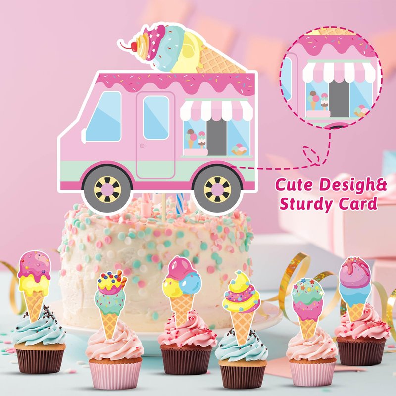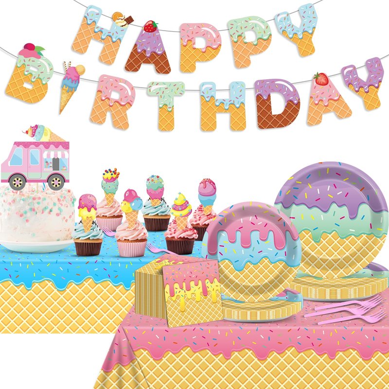 - Durable and Disposable for Easy Cleanup: Our premium quality, disposable ice cream party paper plates and napkins are crafted to be both sturdy and easy to clean up,and they're heat-resistant and resistant to water and oil,making them perfect for a variety of foods without the worry of spills or messes. Cake toppers and banner are made from high quality paper with bright colors and are not easy to fade.