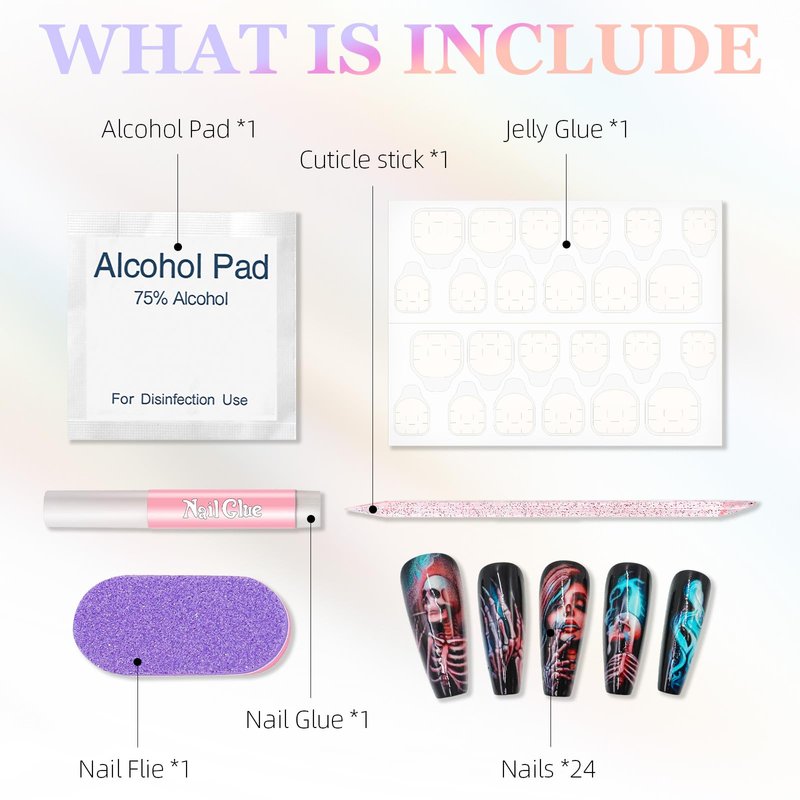 - You will get: 24 fake nails in 12 different sizes with patterns, a mini nail file, a wooden stick, a sheet of jelly gel stickers, nail glue, and alcohol pads. Enjoy a salon nail at home without having to buy other accessories.