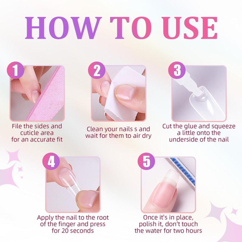 - Easy To Use: Get a salon nail in just a few minutes. After trimming and cleaning your natural nails, choose the right size fake nails, apply our nail gel, and press on nails for 10 seconds.