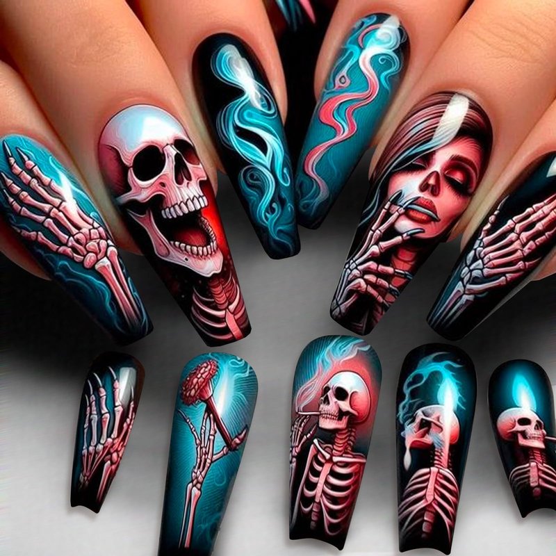Long Coffin Press on Nails Horror Skull Fake Nails Red & Blue Cyberpunk False Nails Full Cover Acrylic Nails Glue on Nails Stick on Nails for Women Girls Halloween Manicure 24Pcs