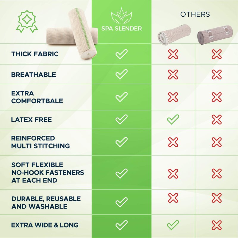 • 6-inch wide, stretches up to 15-feet. Our comfortable premium elastic bandages are durable with reinforced ends to help prevent fraying. They are widely used for body wrap treatments, compression, supporting knees, hand, thigh, arm, foot, ankle, stomach, waist, chest, postpartum, slimming and more. Great for hot and cold press for sprains, c-strains and swelling.
