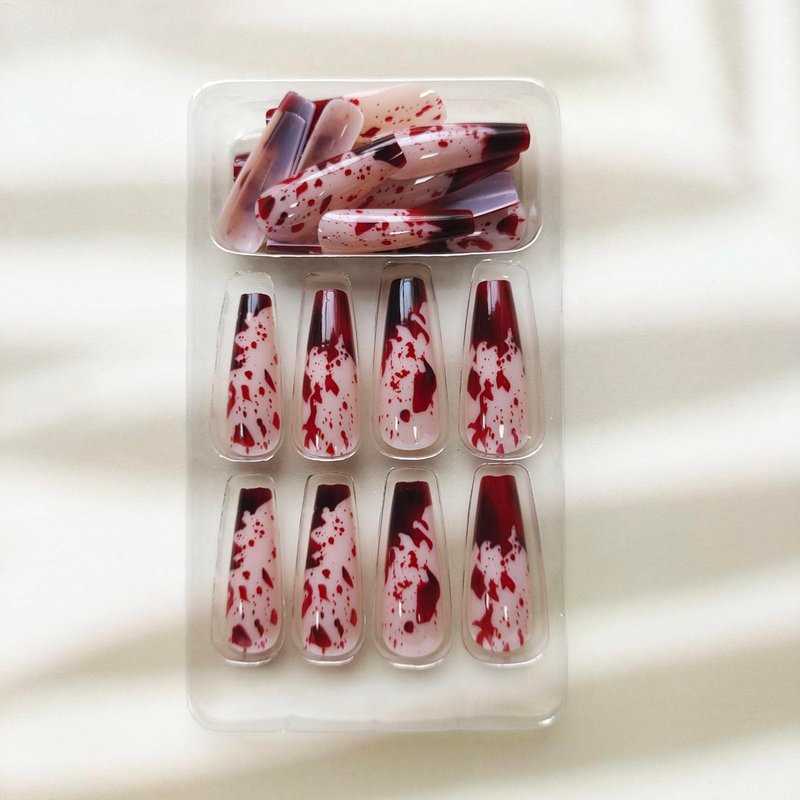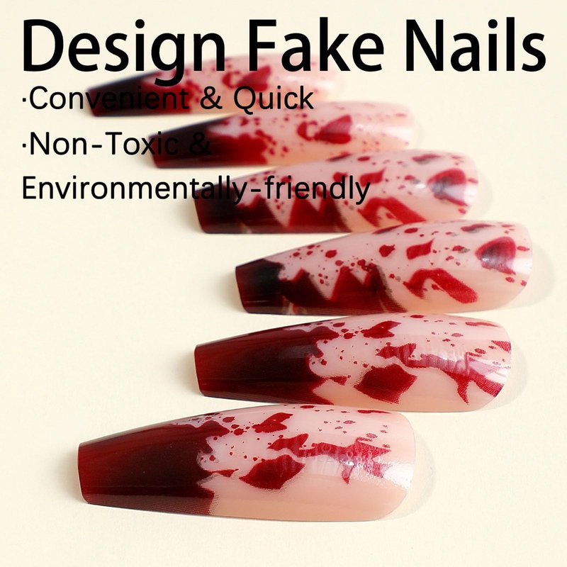 • 【Halloween Design】This long coffin fake nail is designed with classic Halloween blood elements, it looks scary and bloody, it is very suitable for Halloween cosplay party decoration to create a scary atmosphere.