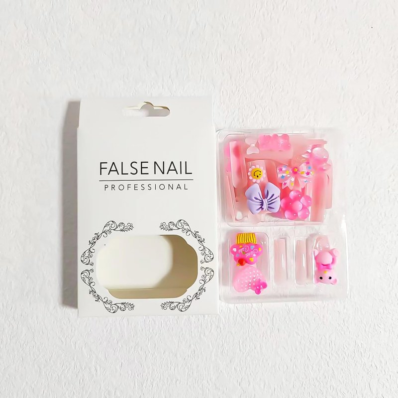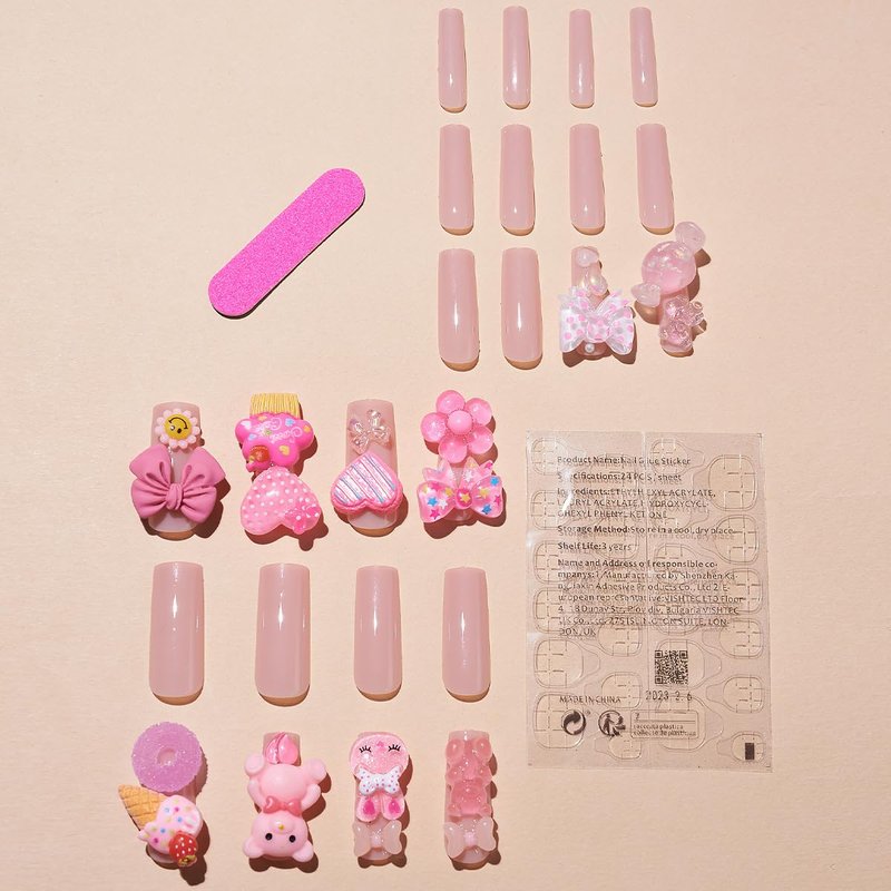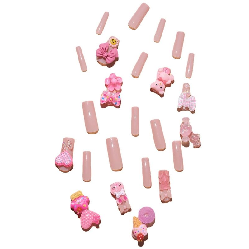 Long Press on Nails Square Fake Nails with Charms Nude Pink Acrylic Nails Cute Heart Bear Charm Designs Glue on Nails Reusable Artificial Full Cover Stick on Nails for Women and Girls 24Pcs
