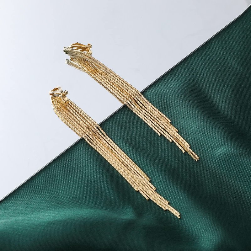 Long Tassel Clip On Dangle Earrings Gold Punk Sleek Metal Chain Clip Earrings Statement Wedding Bridesmaid Jewelry