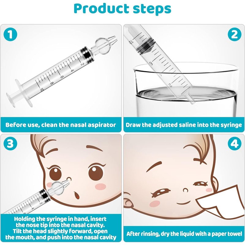 - RINSE KIT --- High quality silicone nasal suction tips and environmentally friendly injection syringes are used, portable 10ml, convenient to use. absolutely safe for babies and can be used safely by children.