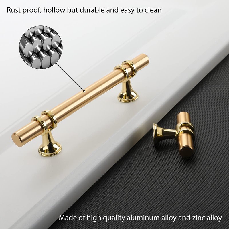 - MATERIAL & FINISHED: The cabinet knobs made of high quality zinc alloyand aluminum alloy; Brushed Brass Gold finished color; Solid metal very sturdy and durable; Hard to get rusty. No sharp edge will protect you when you use.