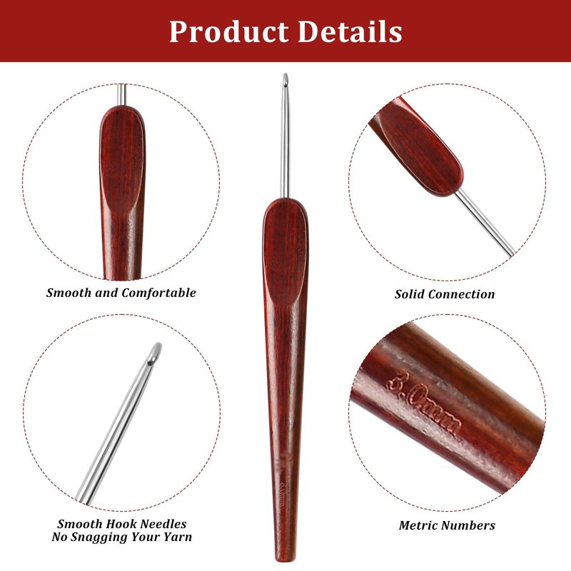 LOOEN Smooth Crochet Hooks with Mertric Numbers and 10 pcs Stitch Markers, 6 pcs Sweing Needles, 1 pc Sandalwood Crochet Hook Bag, Hand Polished Stainless Steel Crochet Hook with Wood Handle(3.0mm)