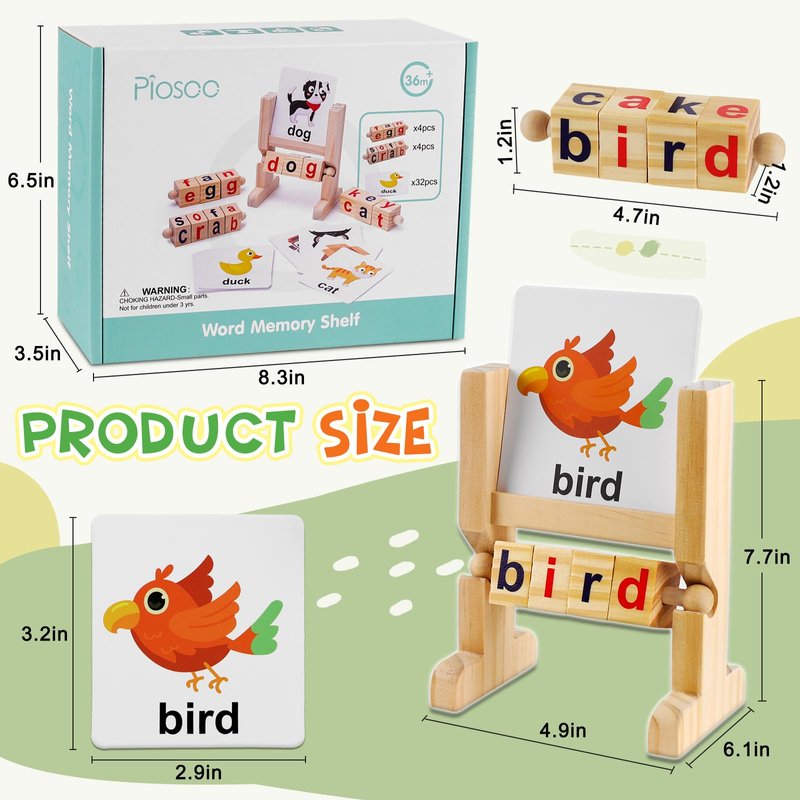 - 【Word craft ABC learning blocks】The 3-6 years old montessori reading toys includes a wooden holder, 8 handheld sets of rotating, 32pcs sight words flash cards and a storage bag. This is the perfect education toy for preschoolers' learning and play, suitable for 3 4 5 6 children's early stages of word pronunciation, developing children's memory skills, spelling skills and word recognition