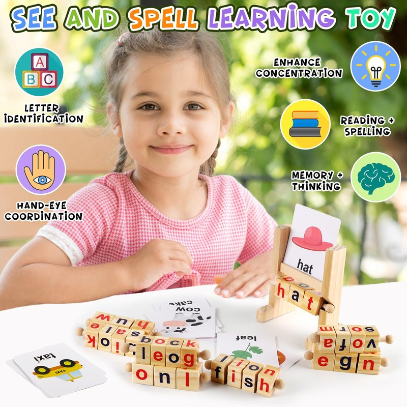 LOOIKOOS Wordcraft Learning Wooden Reading Blocks, Montessori Educational Toys for Kids Flash Cards Toddler Learning Toys Word Building Puzzles Words Spelling Games for Preschool Boys Girls