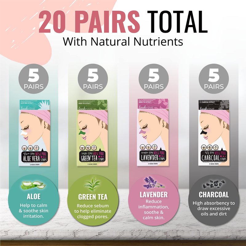 LOOKATME Nose Pore Strips (4-Pack, 20 Nose Strips). Korean Skin Care Blackhead Remover. K Beauty Blackhead Strips for Nose and Face, Black Head Strips Women. Acne Mask for Blackhead Removal. (Combo)