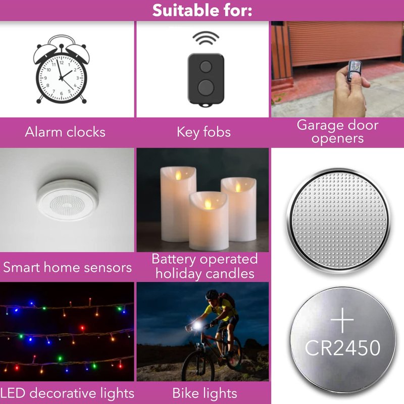 - Suitable for many devices: Our CR2450 3V lithium battery is well suited for alarm clocks, key fobs, garage door openers, bike lights, battery-operated holiday candles, LED decorative lights, smart home sensors and more.