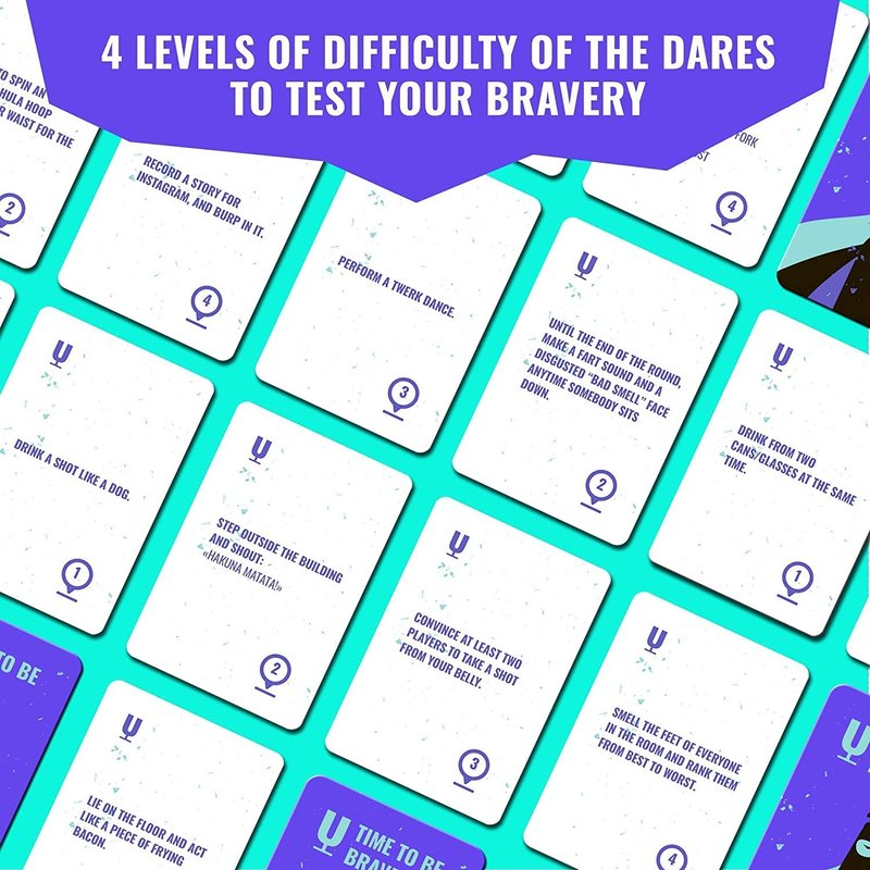 - đ˛ Party card game with 220 cards - this game is jam-jar packed with hilarious dares, terrible humor, unpredictable pranks and absurd tasks. For a party of 3 or a crowd of 16, you can use brave of drunk to turn your night into a riot