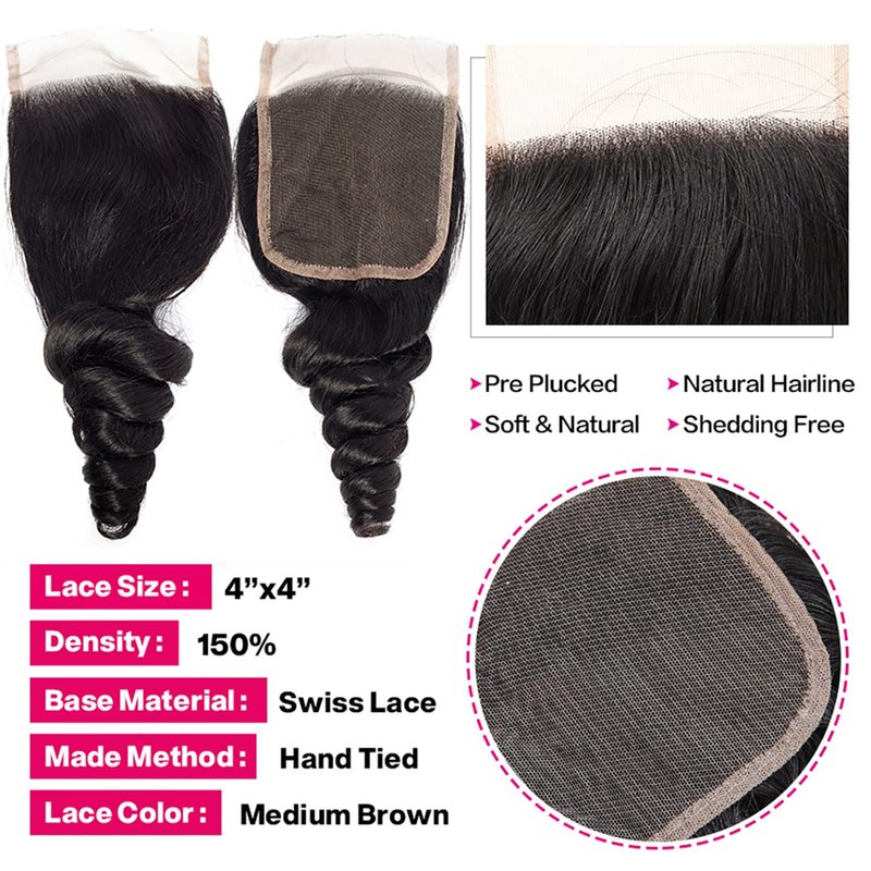 - 2.Hair Quality: High Quality Loose Wave 3 Bundles with Closure, No Shedding, No Tangles, Full Ends, Double Strong Weft, Soft and Silky.Lace Closure:4x4 Lace Closure, Hand Made Swiss Lace Closure , Medium Brown Color, Invisible & Natural Hairline.