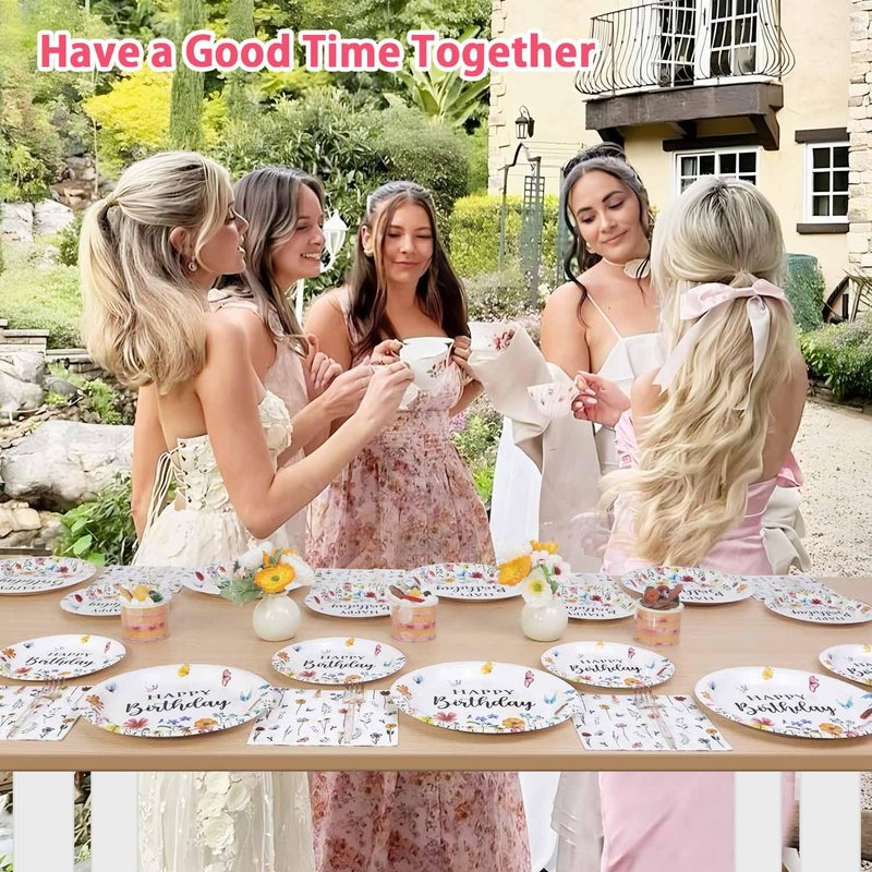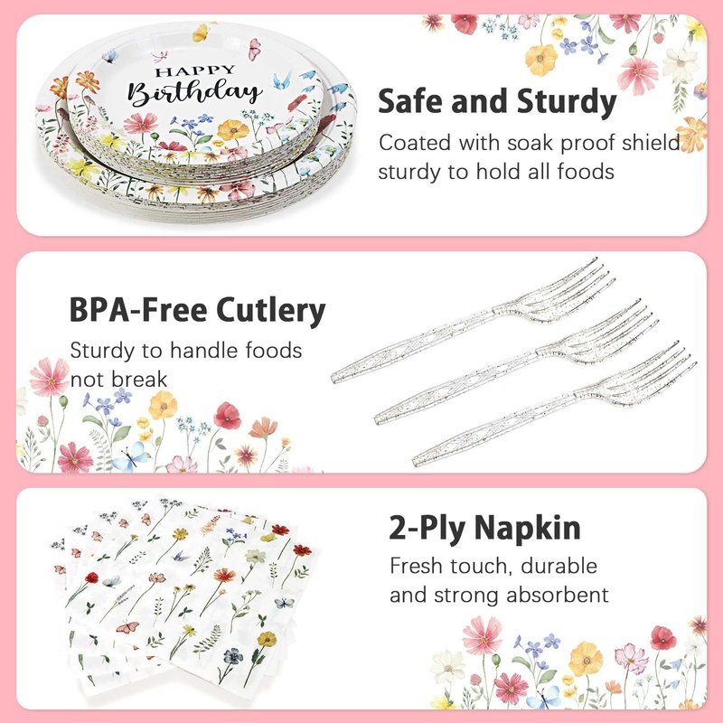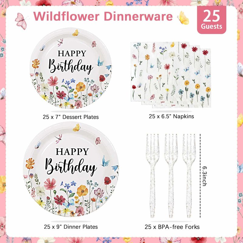 - ALL IN ONE SET: Our wildflower party decorations plates set comes with all for a common party, 25 each of dessert plates, cake plates, napkins and forks. 100% save time and efforts!