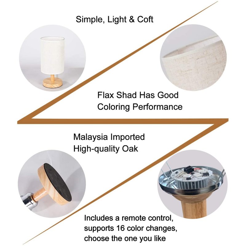This bedside table lamp adopts environmentally friendly design, using nature wood, flax and plastic materials to present a lantern appearance in a simple style. Adding a touch of natural and fresh feeling to your home decor, it is an ideal choice for bedroom, living room, kids room, girls room, study desk lighting.Buy With ConfidenceHaving adhered the most demanding quality control procedures. Any problems or concerns, please tell us directly, and we will provide responsible service as we can.Eye CaringDesign to be soft, stable and non-flickering, the corner desk lamp with flax shade is friendly on your eyes so you can enjoy what you’re doing for longer.Simple DesignA handsome accent lighting for any modern or craftsman style home. Solid wood base and fabric shade provide a natural feeling. Clean, linear and minimalist design, ideal as a Birthday Present.Easy to use.REMOTE CONTROL - ①The remote control has various functions such as adjust brightness, change 16 different RGB colors, 4 flashing modes (flash, fade, smooth, strobe). ② After the touch mode is turned on, you can tap the moon lamp with your hand to change the 16 different RGB colors.There is an ON/OFF Switch with USB plug that makes it super convenient as a bedside table lamp. Place on top of a nightstand, desk, or console table for illumination in sophisticated style.WARM TIPS:- Please let the wood stand stay away from water.What you received is a complete bedsdie table lamp. Our light socket is universal, you can buy it in your near shop. - The size is measured by hand, so there may have a ±0.5in error, please kindly note that.- Recommend putting it in bedroom, kids room, or living room,it will bring you a peaceful and warm night.