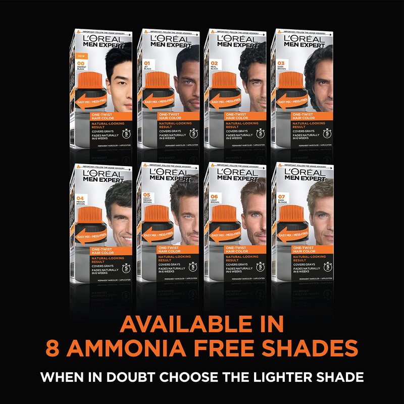 - L'Oreal has created a collection of 8 natural looking mens hair color shades, varying from dark blonde to jet black. A permanent, ammonia free hair color that targets gray coverage