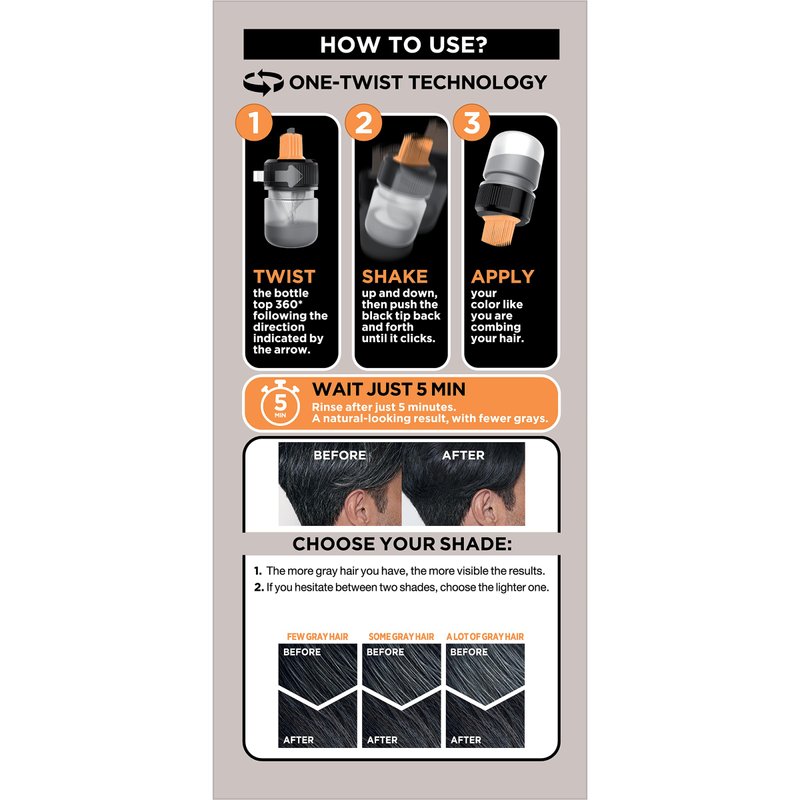 - Easy and Mess Free Application: Our L'Oreal Men Expert hair dye is delivered in a patented ONE TWIST applicator. Simply twist, shake, crack and apply. Blends grays with your original hair color and fades naturally in 6 weeks
