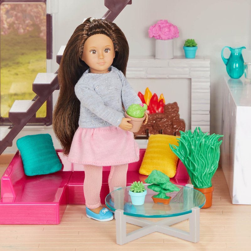 - Living Room Set: A trendy and colorful space where mini dolls can kick back, relax, or spend time with their friends! (Dolls sold separately.)