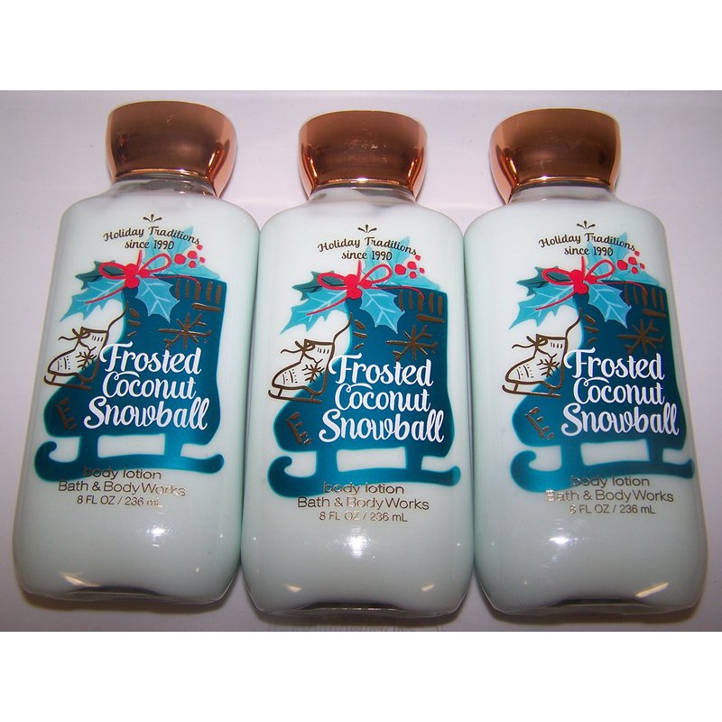 Lot of 3 Bath & Body Works Frosted Coconut Snowball Shea & Vitamin E Body Lotion 8 fl oz / 236 mL each- Enjoy this magical holiday inspired blend of Frosted Coconut, Vanilla, Winter Freesia, Snowkissed Woods and Spun Sugar. Made with Shea Butter, Aloe and a complex of vitamins to nourish and condition your skin. Limited edition scent.