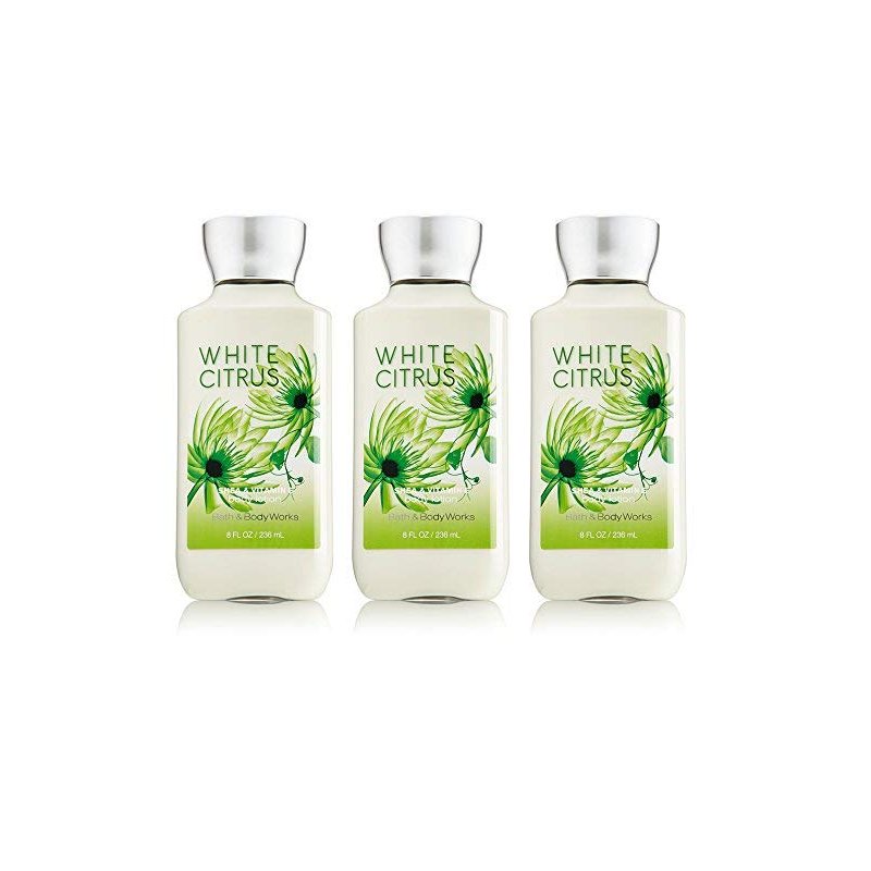 Bath and Body Works - Signature Collection - WHITE CITRUS - Moisturizing Body Lotion Trio - Inspired by the sun-drenched citrus groves of the Mediterranean coast, White Citrus is an invigorating blend of lemon, grapefruit, ginger, freesia, and clean wood. (Bottle Artwork May Vary as Seasonally Refreshed by Manufacturer).