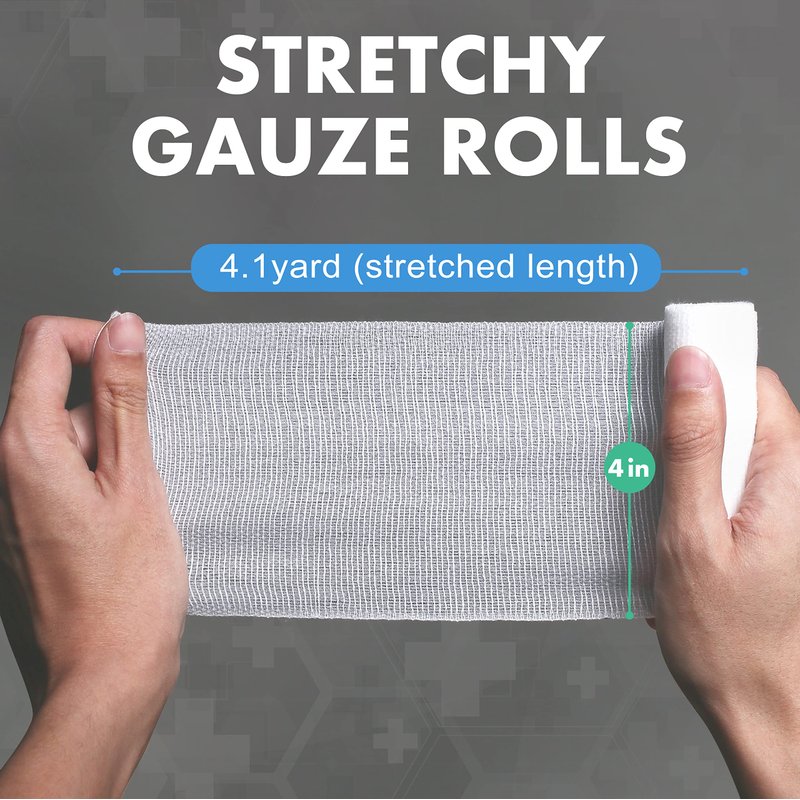 - STRETCHABLE & FLEXIBLE GAUZE: medical gauze easily stretches to conform to the wound site and the 4in gauze rolls provides optimal coverage of various wound types; the conforming stretch gauze bandage can cut-to-fit or use as an overlap dressing, works well on knee, arm, leg, wrist, elbow, ankle, hands and any body parts