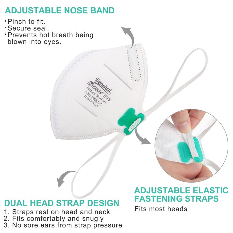 - HEADBAND DESIGN: Head straps style N95 masks are more comfortable and safer than the ear elastic style mask; Head straps masks provide better tightness and eliminate the pain behind the ears